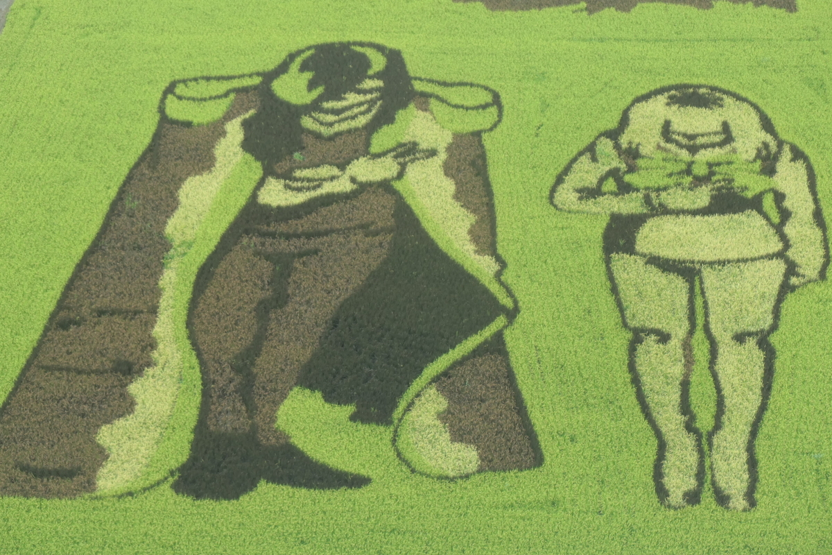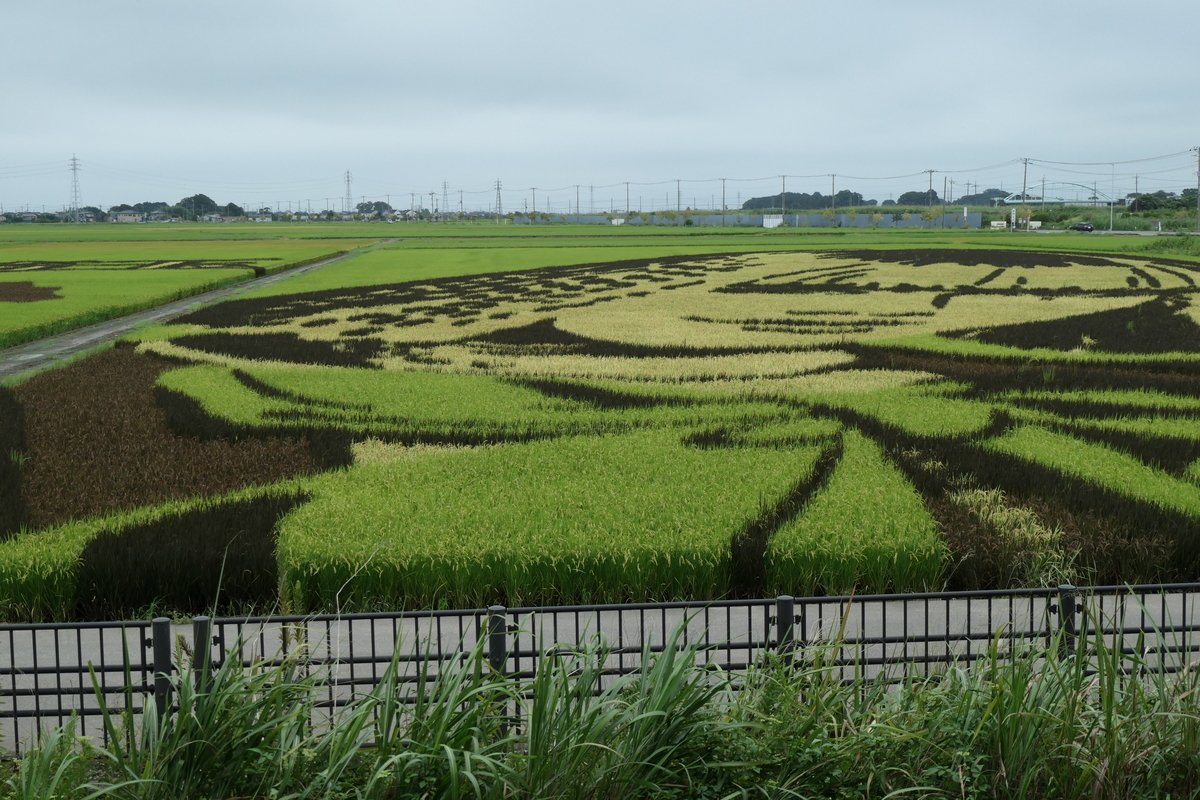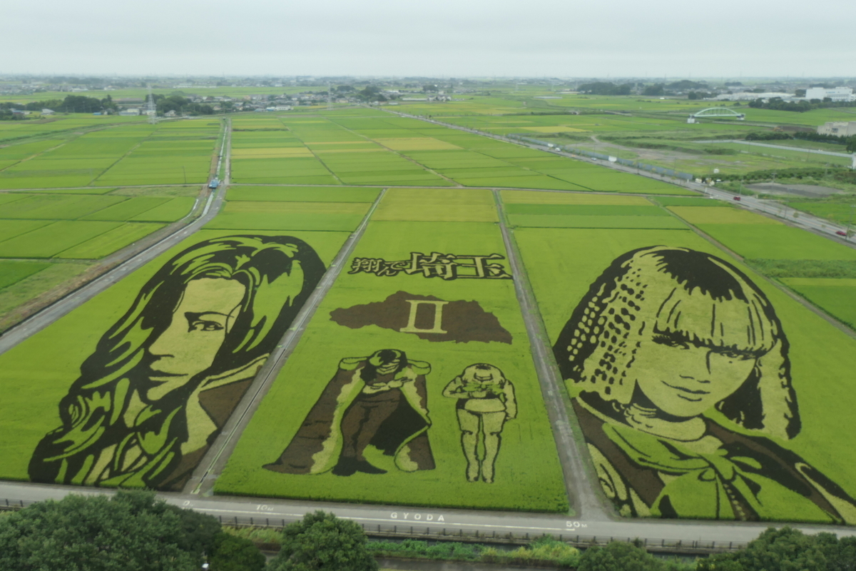埼玉県の行田市、先日のぶらタモリで放送していたので訪問。駅前から循環バスに乗って古代ハス公園で下車。蓮の時期は終わってますが、田んぼアートは観賞が出来ました。田んぼの近くに行っても、色の違う稲が植えられているのは分かりますが、どんな絵なのかは判りません。公園にある展望タワーに登ると良くわかります。田んぼアートを見るために建てたのか、不思議に思いながら観賞しました。