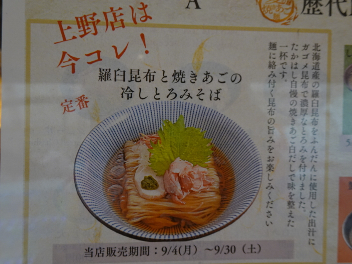 御徒町のラーメン屋さん「焼きあご塩らー麺 たかはし」にて羅臼昆布と焼きあごの冷しとろみそばのランチ